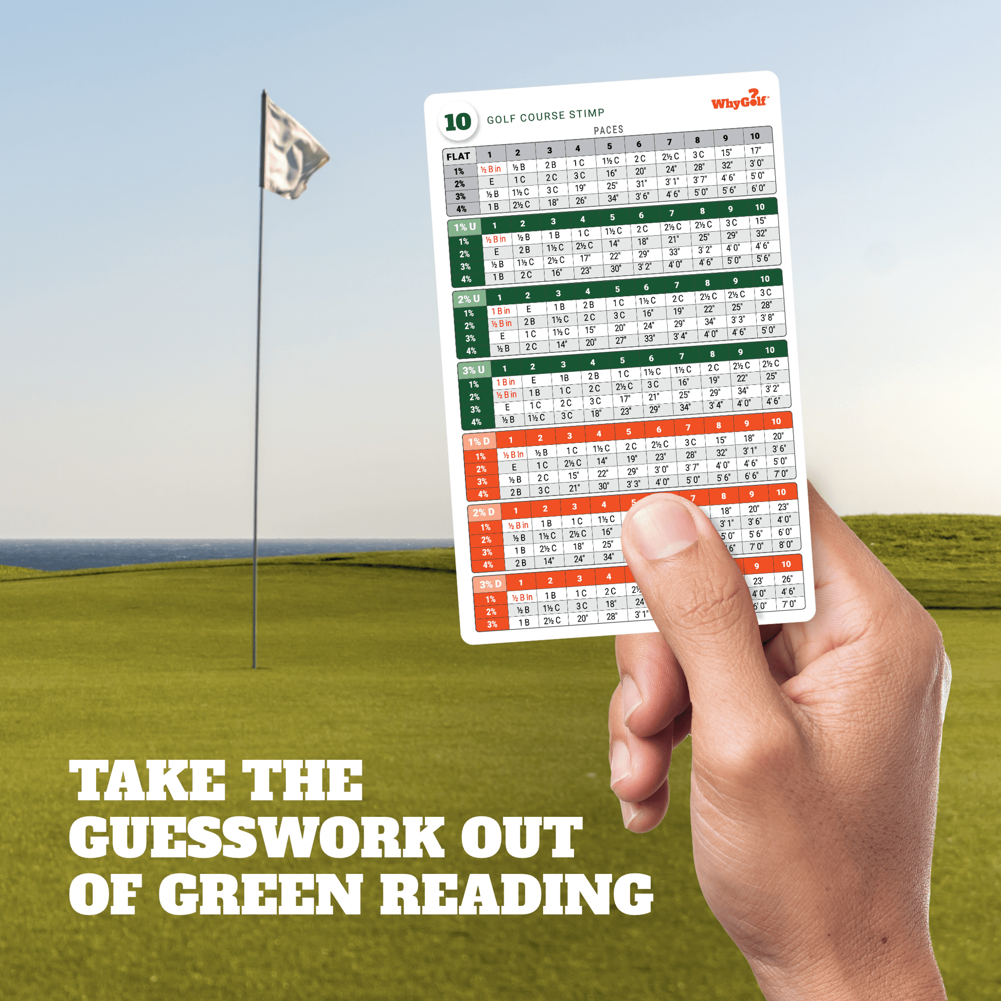 Once you know the slope for any given putt, you’ll learn how to use our Green Cards to determine the EXACT break (i.e. where to aim)